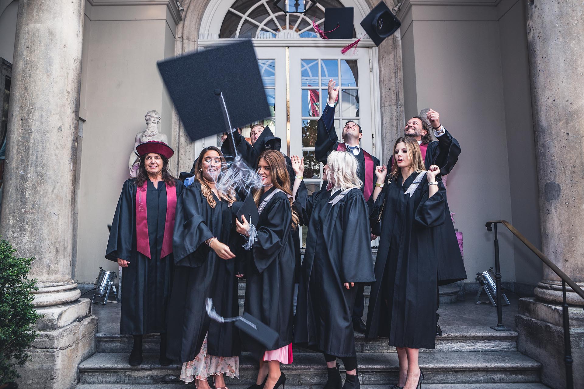 Die Abschlussfeier der Hochschule Macromedia findet regelmäßig im Künstlerhaus am Lenbachplatz statt. Das Künstlerhaus wurde als Begegnungsstätte zwischen Kunst und Gesellschaft erbaut. Der schöne Festsaal ist für die Feierstunde perfekt geeignet. An diesem Abend wird gelacht, gefeiert und natürlich werden auch die obligatorischen Hüte geworfen. Freude und Erleichterung sieht man den Absolventen auf jedem Bild an.